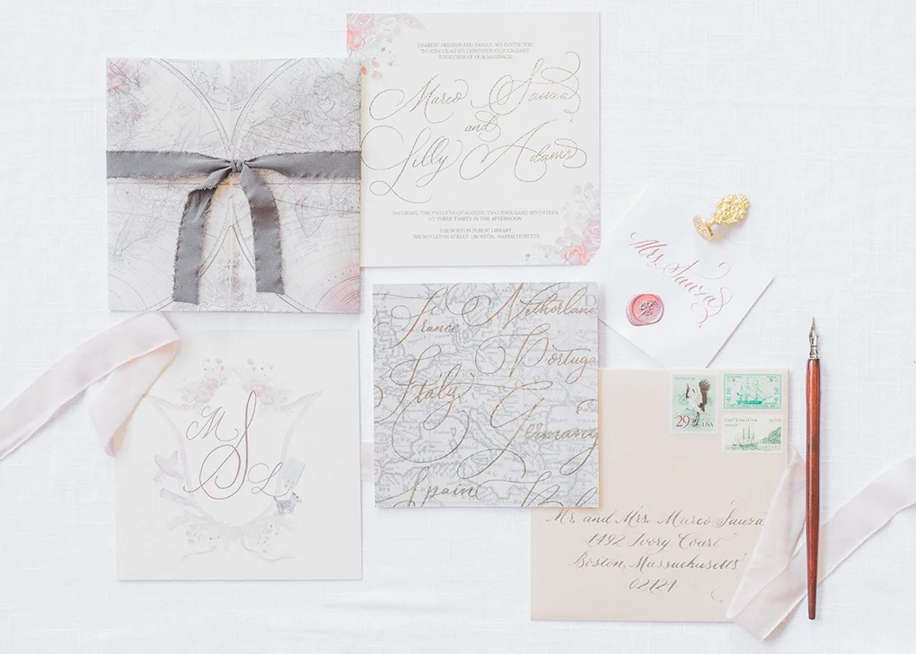 Wedding Invitation Design With A Travel Theme Featuring Antique Maps And Custom Watercolor Illustration Blush Blue